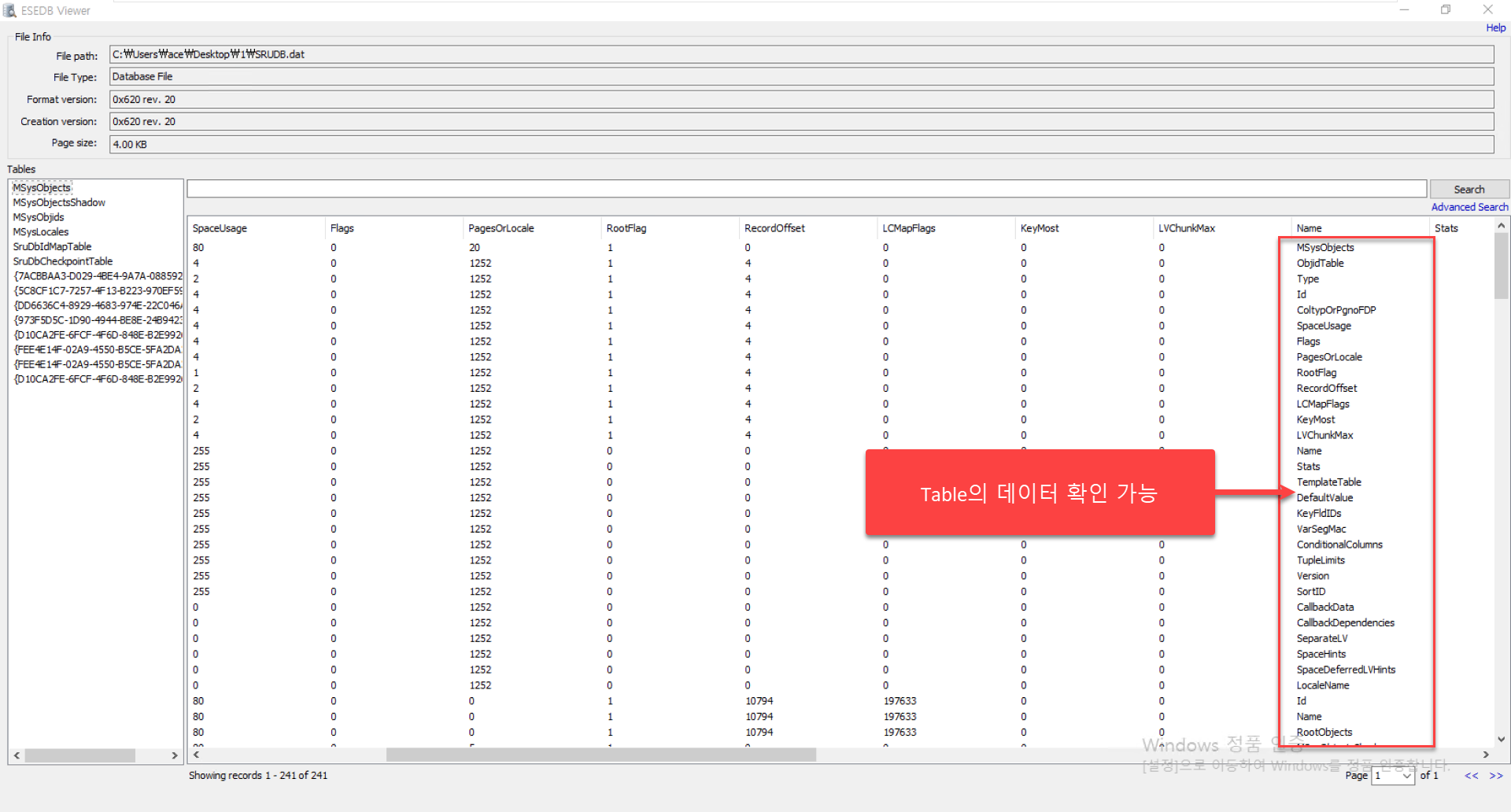 SRUDB.dat 파일의 내부를 확인하기 위해 View 모듈을 실행합니다.