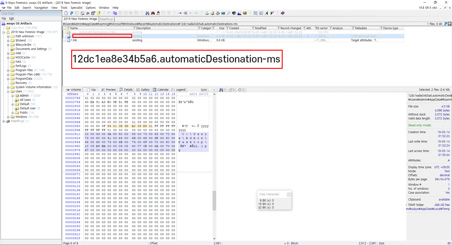 파일 이름은 모두 16자리의 16진수 형식의 값으로 이루어져있고, 확장자는 “.automaticDestination-ms”이다.