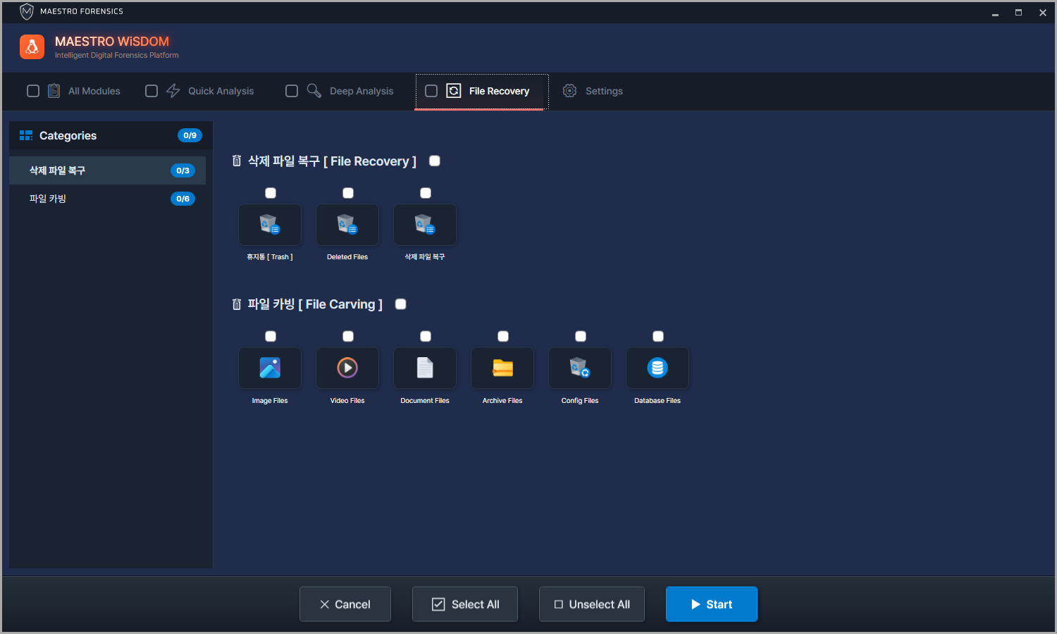 파일 복구( File Recovery ) 항목은 기본적인 파일 복구 항목과 카빙 2가지 복구 방법을 선택할 수 있습니다.