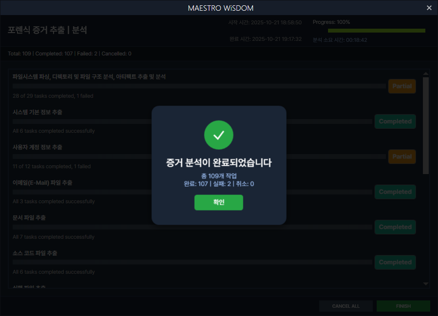 아티팩트 선택 종료 후 추출을 시작하면 스크린샷과 같이 프로세싱 진행 상태를 확인할 수 있습니다.